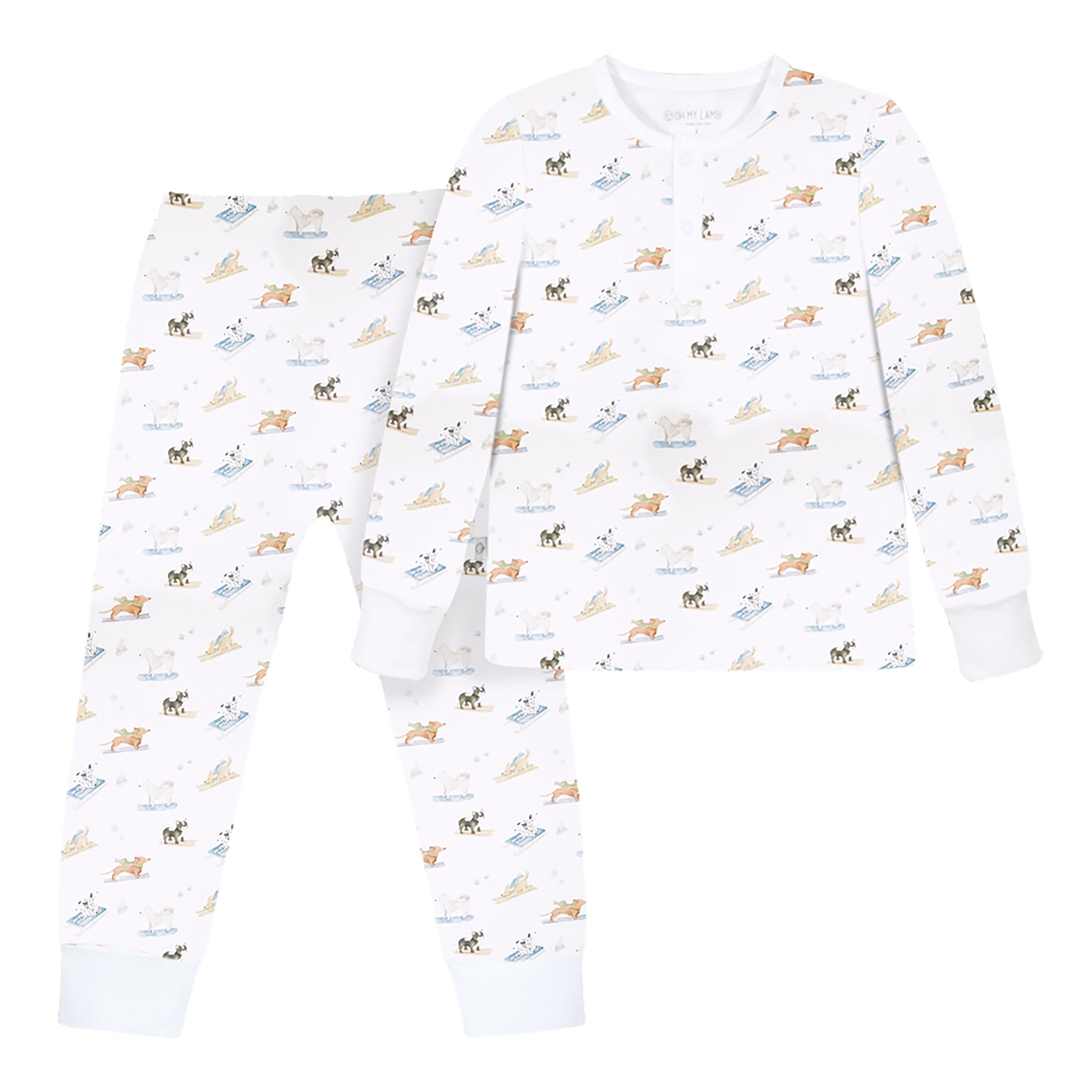 These adorable pajamas feature a lively print of playful puppies hitting the slopes—bringing snowy fun and cozy vibes to your little one’s bedtime routine. Made from ultra-soft 100% Pima Cotton, this long-sleeve and long-pant set is perfect for year-round comfort—especially for kids who love to stay cozy and covered all night long.